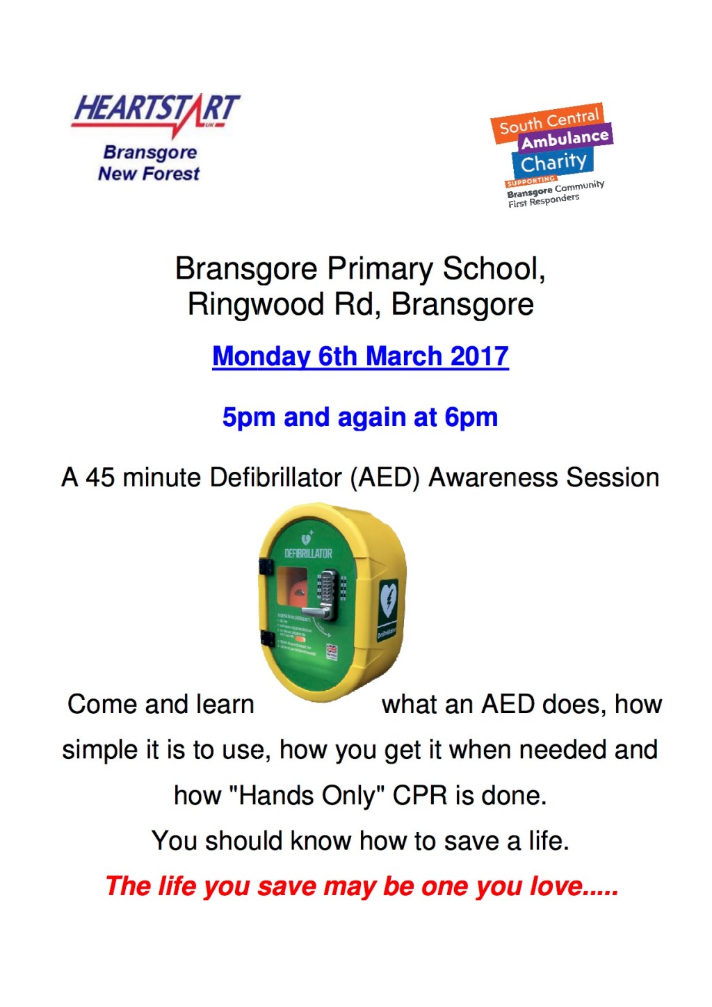 People of Bransgore – come along to this free defibrillator training at Bransgore Primary School – one day it may help you save someone’s life!