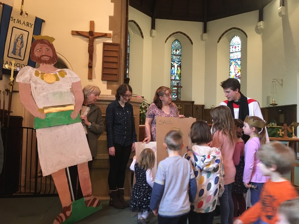 What a fantastic job the St Mary’s Sunday School team are doing. Over the last couple of months a lot effort has been put into the Sunday School (special thanks to Fiona Beale for sorting out people for the team and putting together the rota!). The children are learning about the bible through games and arts and crafts. Today the children made necklaces from pasta, crowns from golden card and a giant Saul.