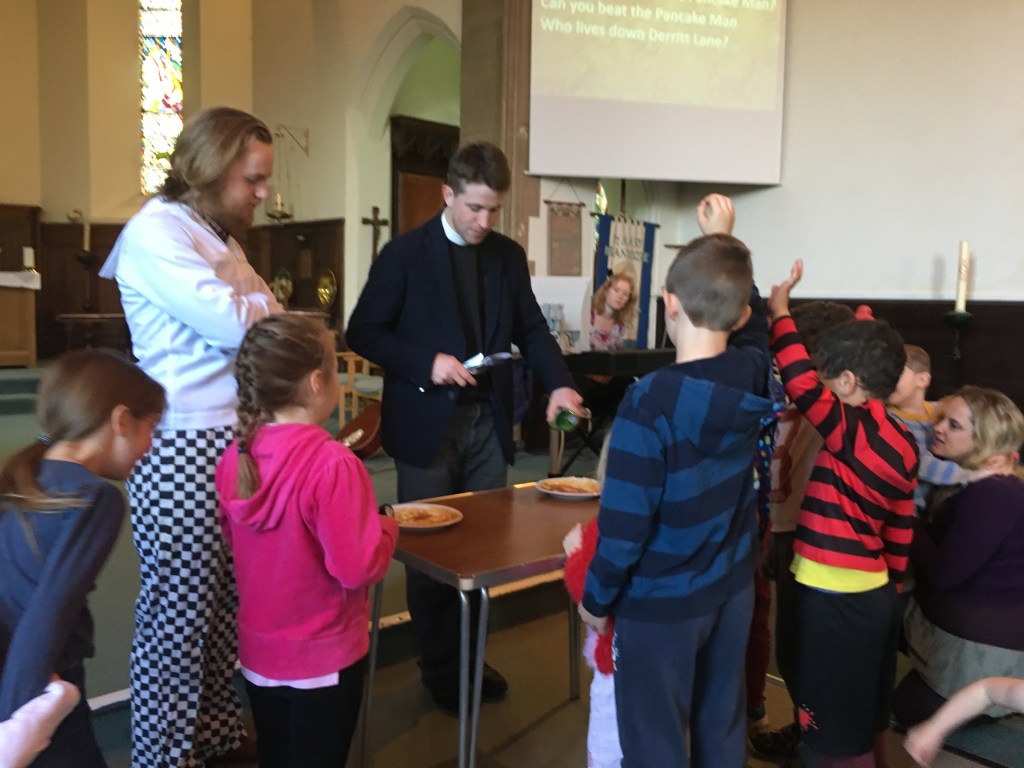 What a great service. The Pancake Man from Derritt Lane came to St Mary’s to lead us in song and set the challenge to both children and adults of beating him in how many times one could flip a pancake in 30 seconds, and then a challenge of eating a cold pancake covered only in lemon juice.